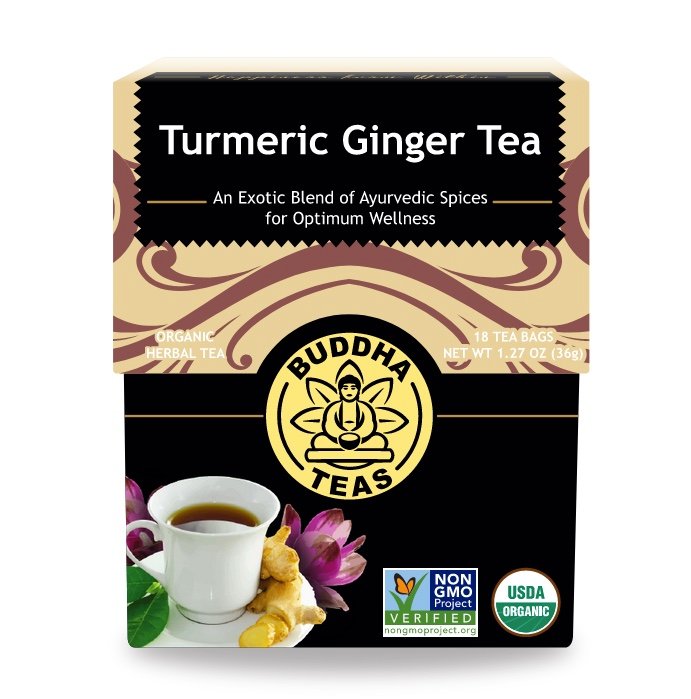 Buddha Turmeric Ginger Tea Frequently paired for consumption, the combination of turmeric and ginger in tea is an obvious winner when seeking a warming, stimulating cup. Considered close relatives as far as roots go, in this instance together really is better.